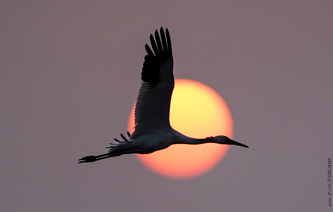 Белый журавль пролетает над заповедником в Наньчане, Китай