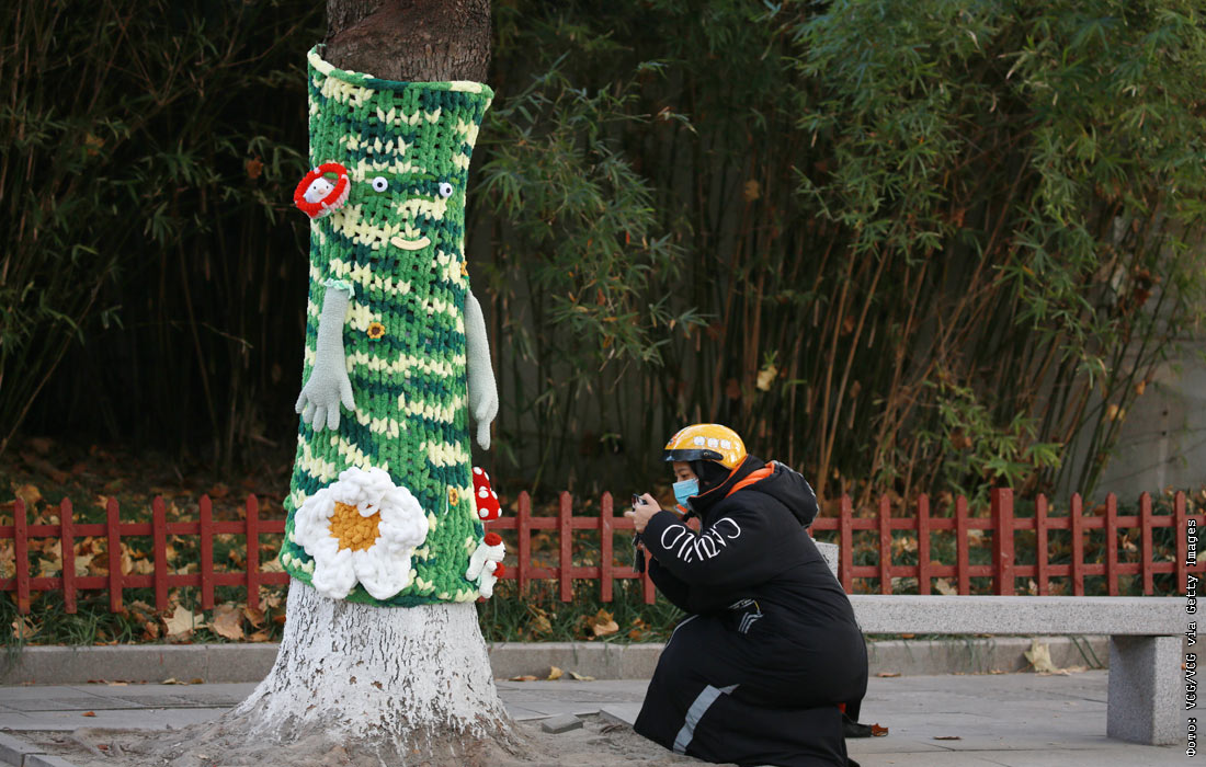 В китайском Наньтуне деревья нарядили в яркие вязаные свитера
