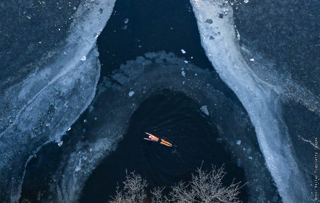 Мужчина плавает в озере в Шэньяне, Китай