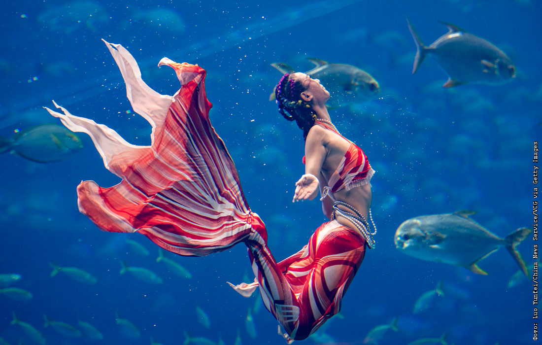 Участница Открытого чемпионата Китая по русалочьему плаванию в Санье