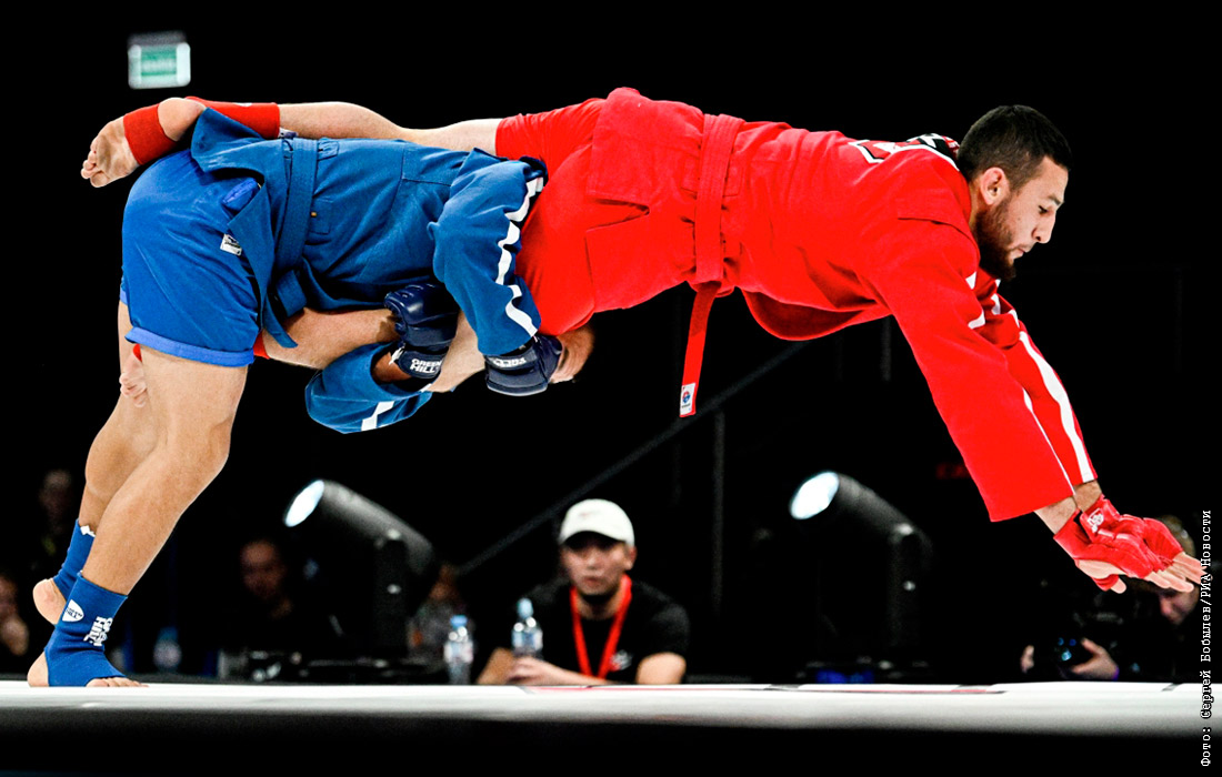 Эльхан Орозалиев (Киргизия) и Джамолдин Сандалов (Россия) в поединке на Гран-при Лиги боевого самбо в Москве