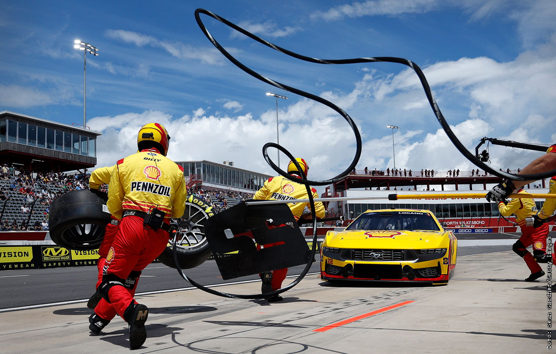 Джоуи Логано, пилот Shell-Pennzoil Ford Mustang № 22, заезжает на пит-стоп во время квалификации к гонке всех звезд серии NASCAR Cup в Норт-Уилксборо, штат Северная Каролина, США