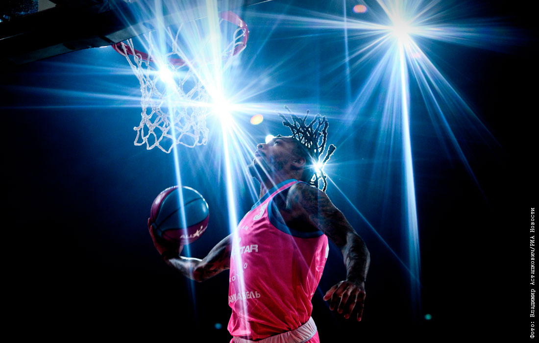 Игрок Девон Акун-Пёрселл участвует в конкурсе по броскам сверху на матче всех Звезд 2024 Единой Лиги ВТБ в Москве