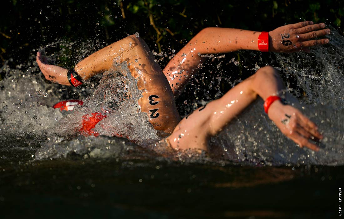 Спортсмены соревнуются в плавании на дистанции 10 км среди мужчин на летних Олимпийских играх 2024 года в Париже