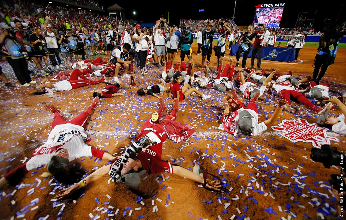 Игроки "Оклахома Сунерс" празднуют титул чемпионов Мировой серии среди женщин по софтболу NCAA в Девон-парке, штат Оклахома, США