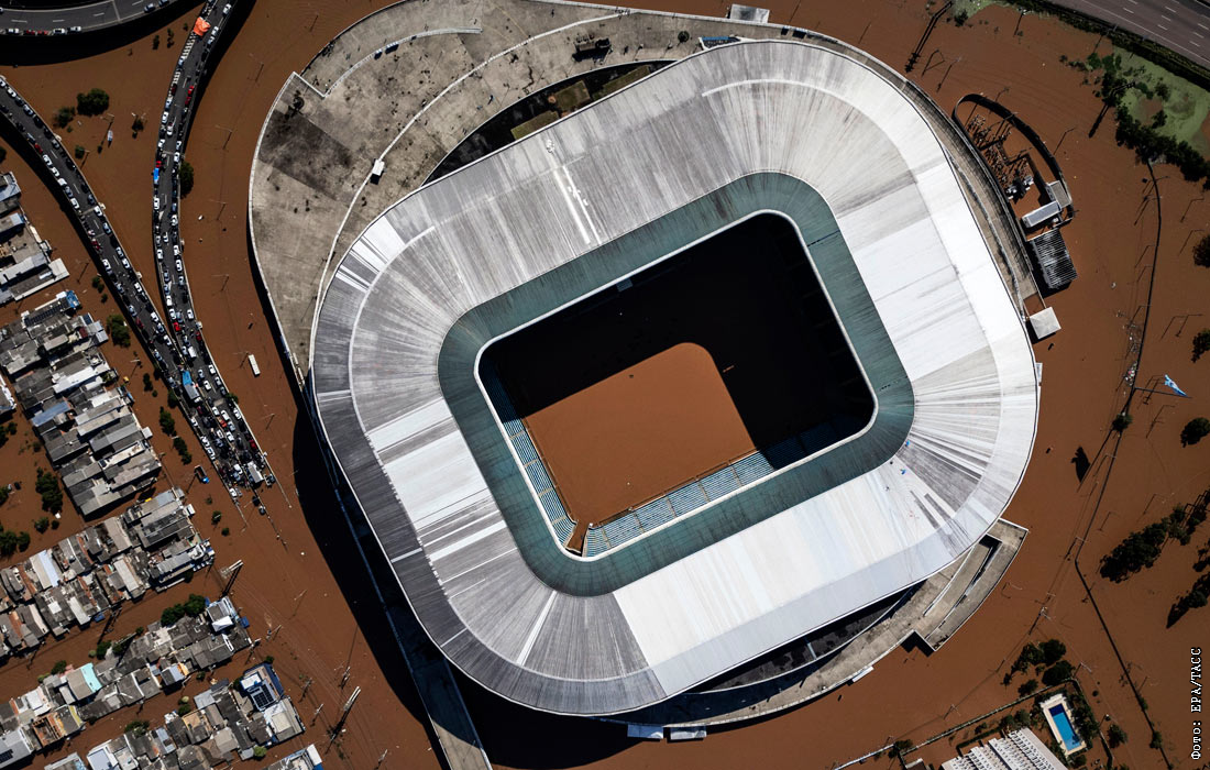 В мае из-за самого мощного за последние 80 лет наводнения в Бразилии погибли по меньшей мере 180 человек. На фото: затопленный стадион "Арена ду Гремио" в Порту-Алегри.