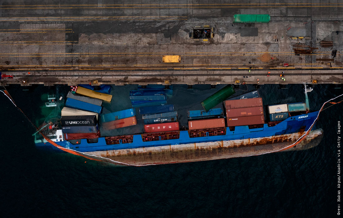 В Стамбуле в порту Амбарли контейнеровоз опрокинулся на бок. С борта судна эвакуировали 15 человек.