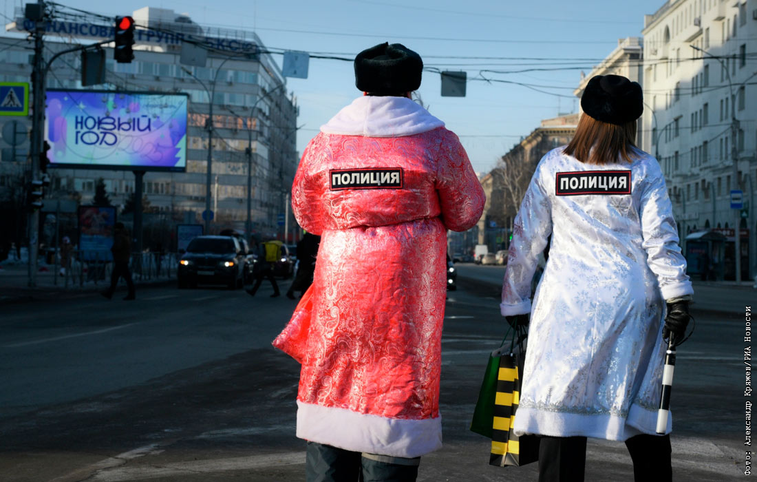 Сотрудники Госавтоинспекции в костюмах поздравляют водителей с наступающим Новым годом в Новосибирске