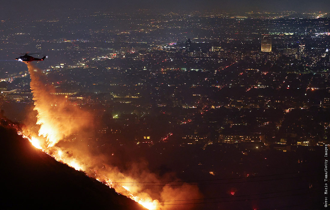 В американском штате Калифорния объявлен режим бедствия в связи с лесными пожарами. Они начались во вторник, огонь быстро распространяется из-за ветра. По меньшей мере пять человек погибли и более 1 тыс. строений уничтожены пожарами в районе Лос-Анджелеса.