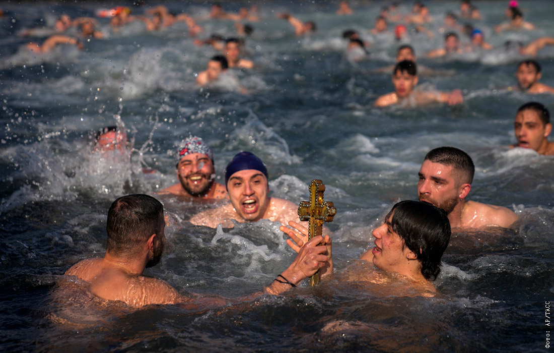 Верующие православной церкви во время церемонии ныряния за деревянным крестом в канун Рождества в Стамбуле