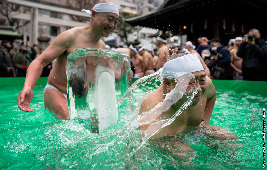 Традиционное купание в ледяной воде во дворе синтоистского храма Теппозу Инари в Токио