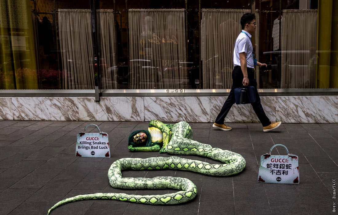 Зоозащитники из организации PETA во время акции протеста перед магазином Gucci в Куала-Лумпуре, Малайзия