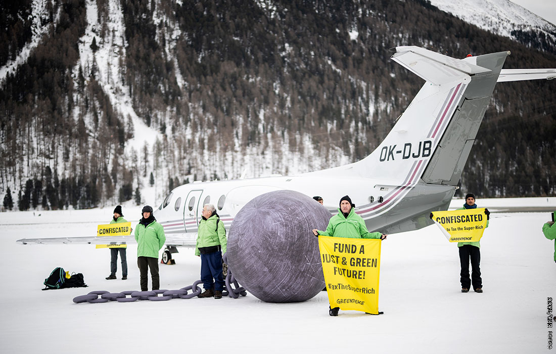 Акция экоактивистов перед частным самолетом во время 55-й ежегодной встречи Всемирного экономического форума в Самедане