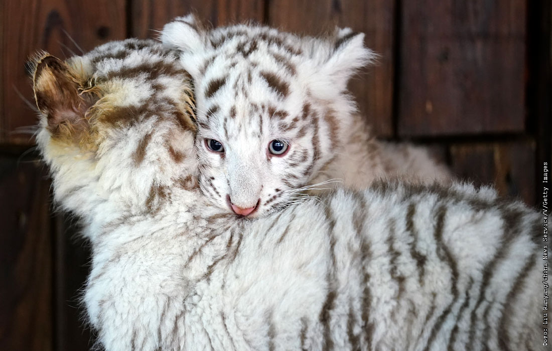 Детеныши белого бенгальского тигра в парке дикой природы в Куньмине, Китай