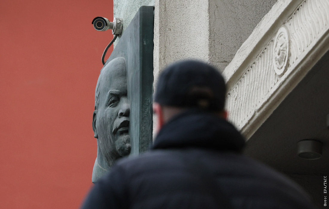 Мужчина проходит перед барельефом Владимира Ленина в центре Москвы