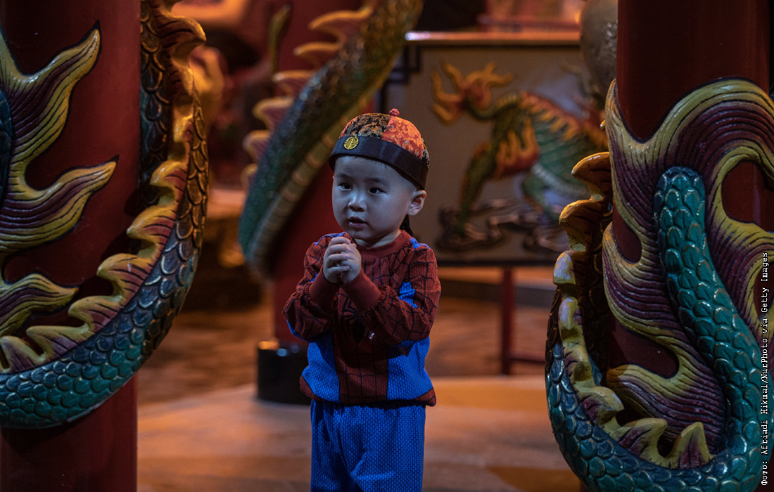 Мальчик возносит молитвы в храме в Джакарте, Индонезия