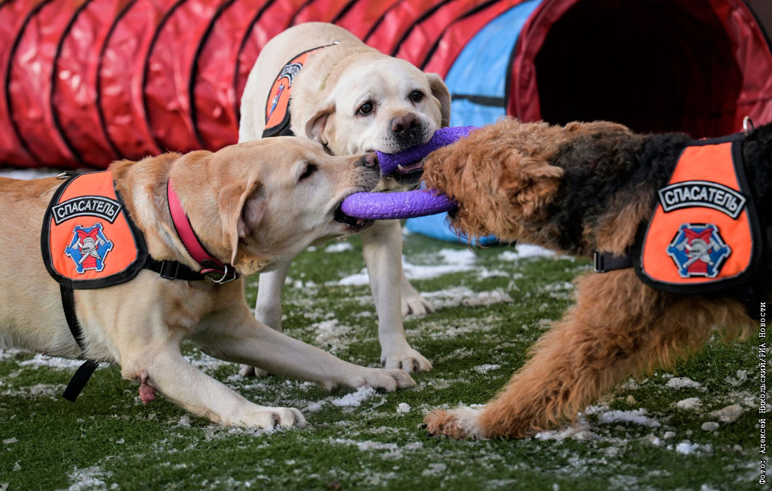 Тренировка собак-спасателей в пожарно-спасательном центре в Москве