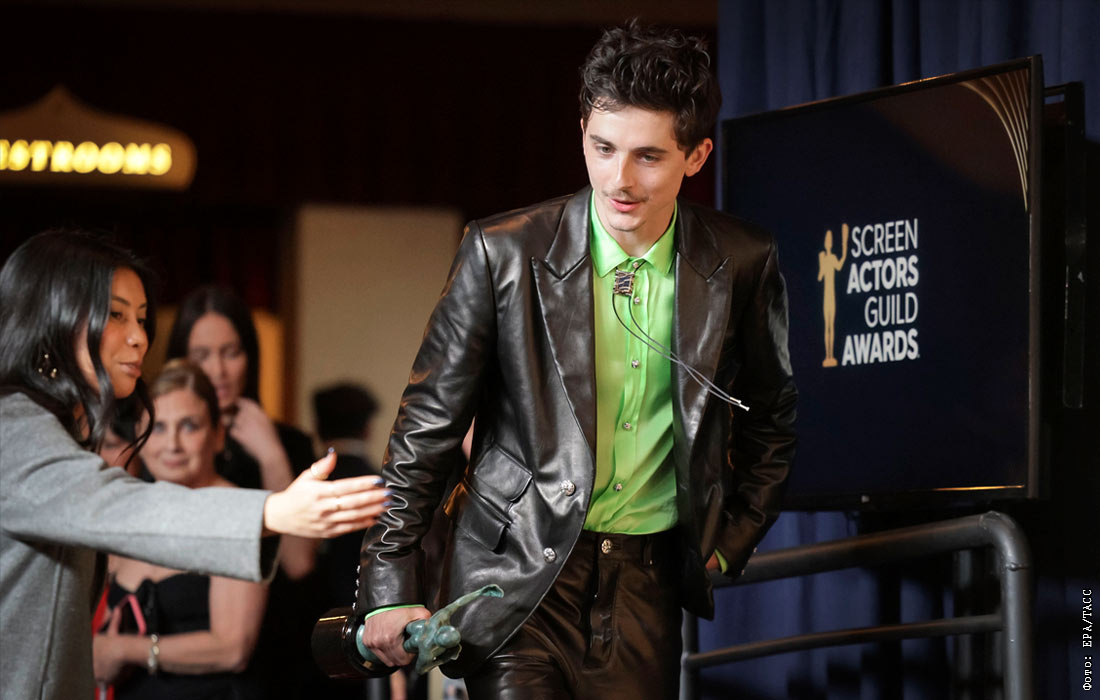 Актер Тимоти Шаламе, получивший награду в номинации "Лучшая мужская роль" за роль в фильме "Боб Дилан: Никому не известный"