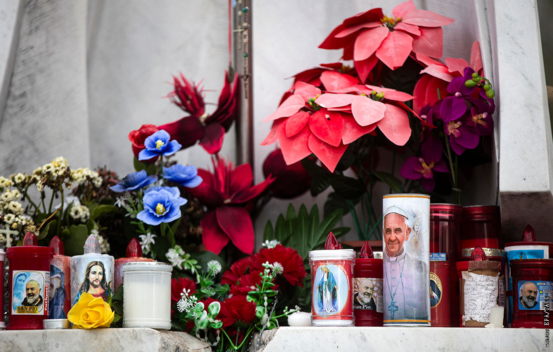 Папа римский Франциск остается в больнице из-за инфекции дыхательных путей. На фото: цветы и свечи у больницы имени Агостино Джемелли.