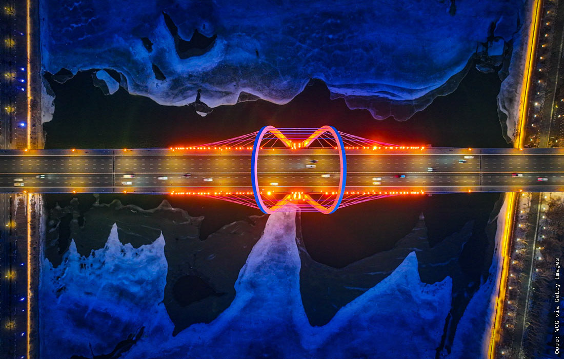 Автомобильный мост пересекает покрытую льдом реку Хунхэ в Шэньяне, Китай