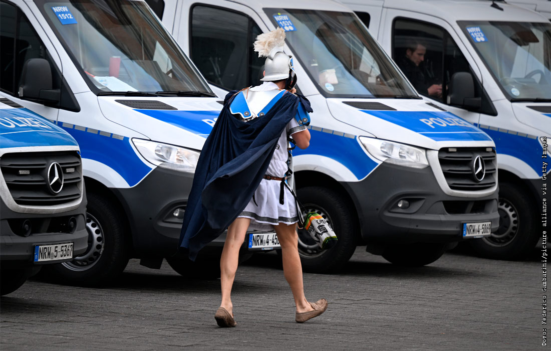 Участник карнавала у здания мэрии Дюссельдорфа в Германии