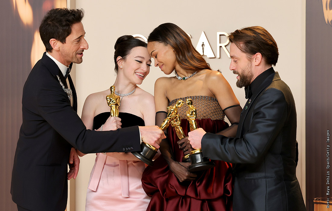 Эдриан Броуди, победитель в номинации "Лучший актер", Майки Мэдисон, победительница в номинации "Лучшая актриса", Зои Салдана, победительница в номинации "Лучшая актриса второго плана", и Киран Калкин, победитель в номинации "Лучший актер второго плана"