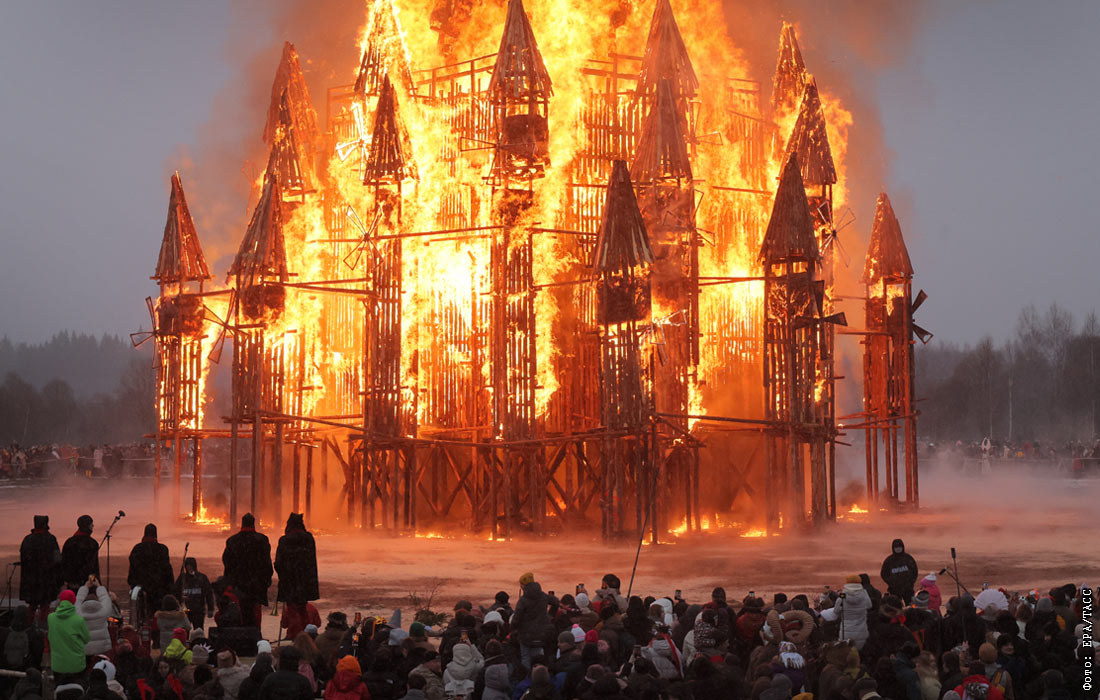 В минувшие выходные в парке Никола-Ленивец в Калужской области состоялось традиционное сжигание арт-объекта в честь Масленицы