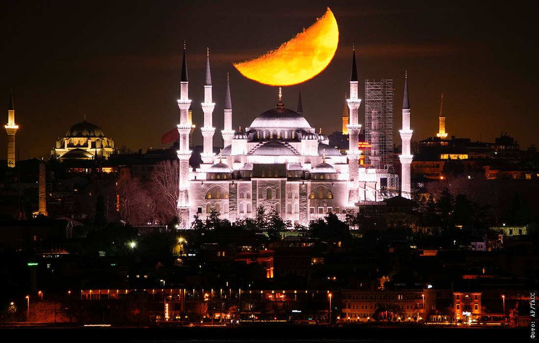 Полумесяц над мечетью Султанахмет во время месяца Рамадан в Стамбуле
