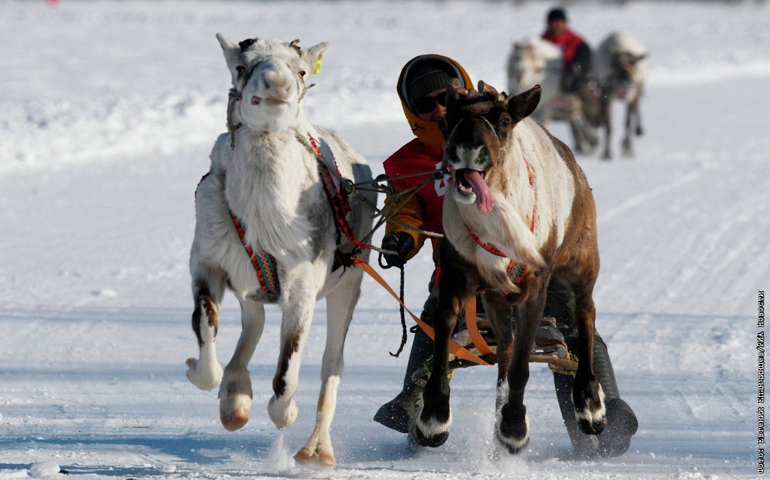 Минутный заезд на упряжках на праздновании межрегионального праздника "День оленевода" в Забайкальском крае