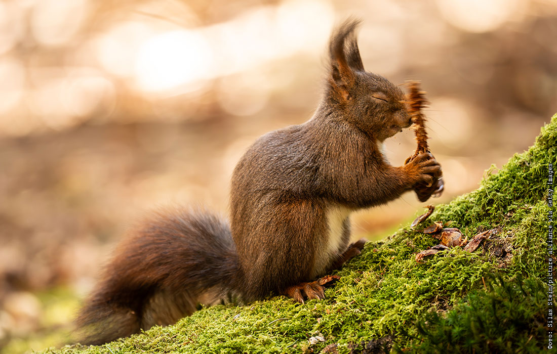 Белка ест в лесу Донисвальд недалеко от немецкого Кенигсфельда
