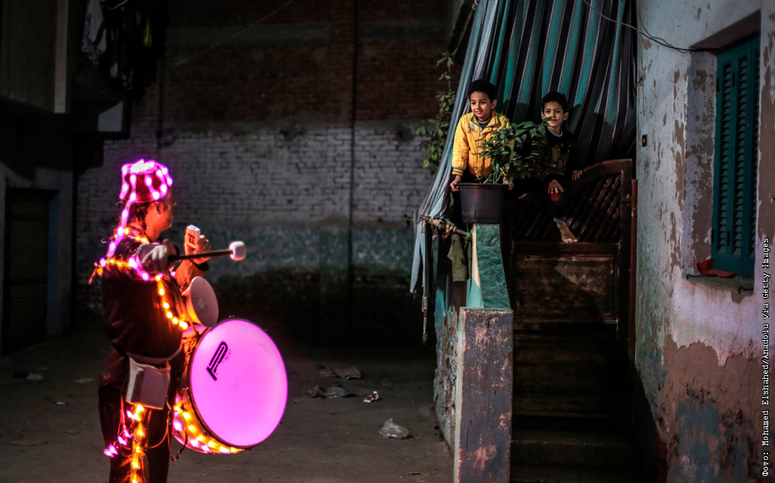 Барабанщик приглашает соседей на вечернюю трапезу во время Рамадана на севере Каира, Египет