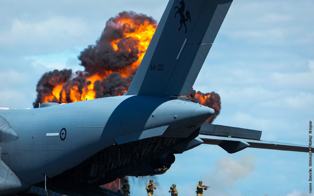 Личный состав министерства обороны Австралии покидает самолет RAAF C-17A Globemaster во время демонстрации средств ПВО на Международном авиашоу "Авалон"