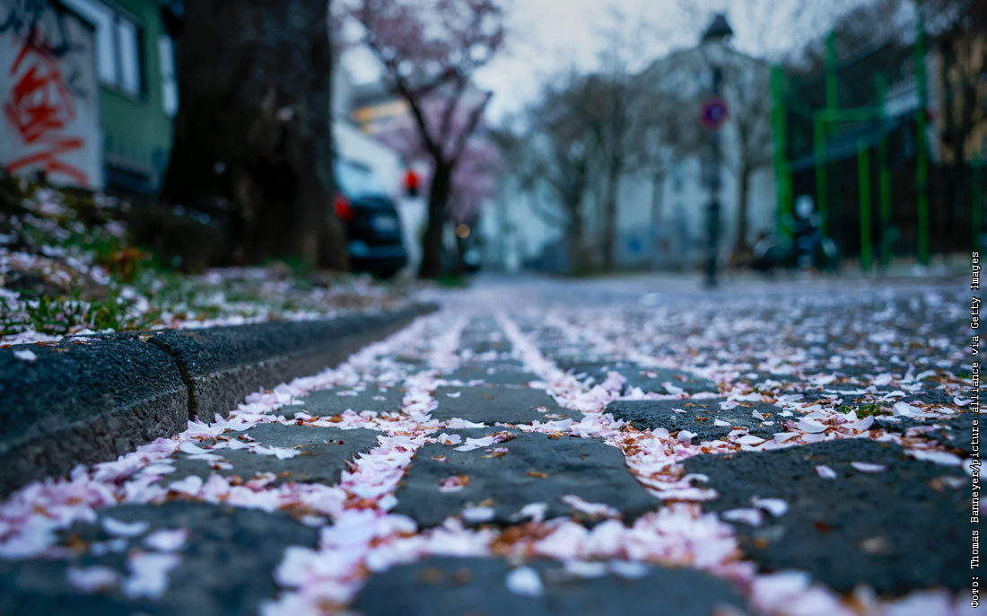 Лепестки сакуры на улице в Бонне, Германия