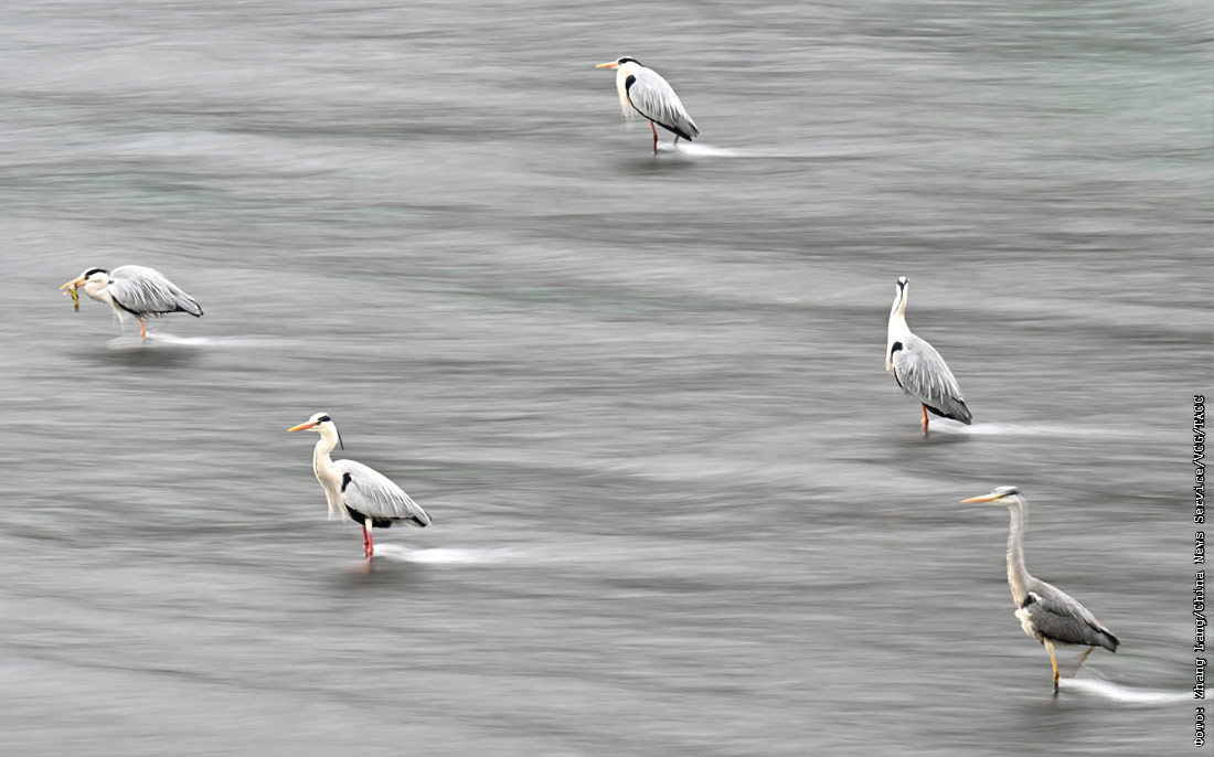 Цапли ловят рыбу на плотине в Чэнду, Китай