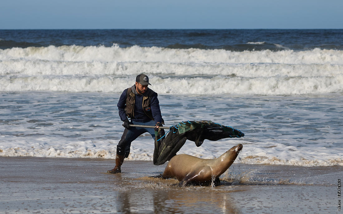 Сотрудник Центра по уходу за морскими млекопитающими ловит морского льва, пострадавшего от цветения токсичных водорослей у побережья Калифорнии