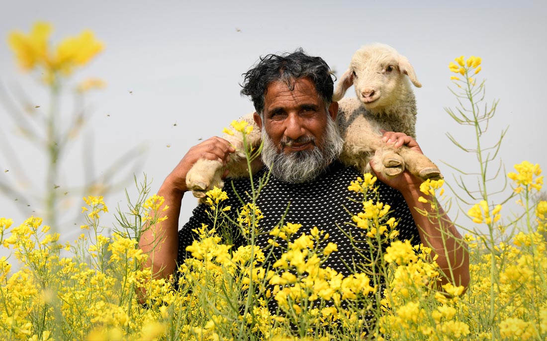 Пастух несет ягненка по горчичному полю в Южном Кашмире, Индия