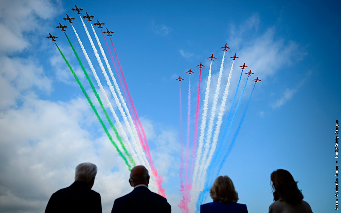 Президент Италии Серджо Маттарелла (слева), его дочь Лаура (справа), король Великобритании Карл III и королева Великобритании Камилла (в центре) во время просмотра авиашоу ВВС Италии в Риме