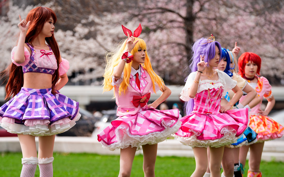 Девушки фотографируются среди цветущих деревьев на острове Рузвельта в Нью-Йорке