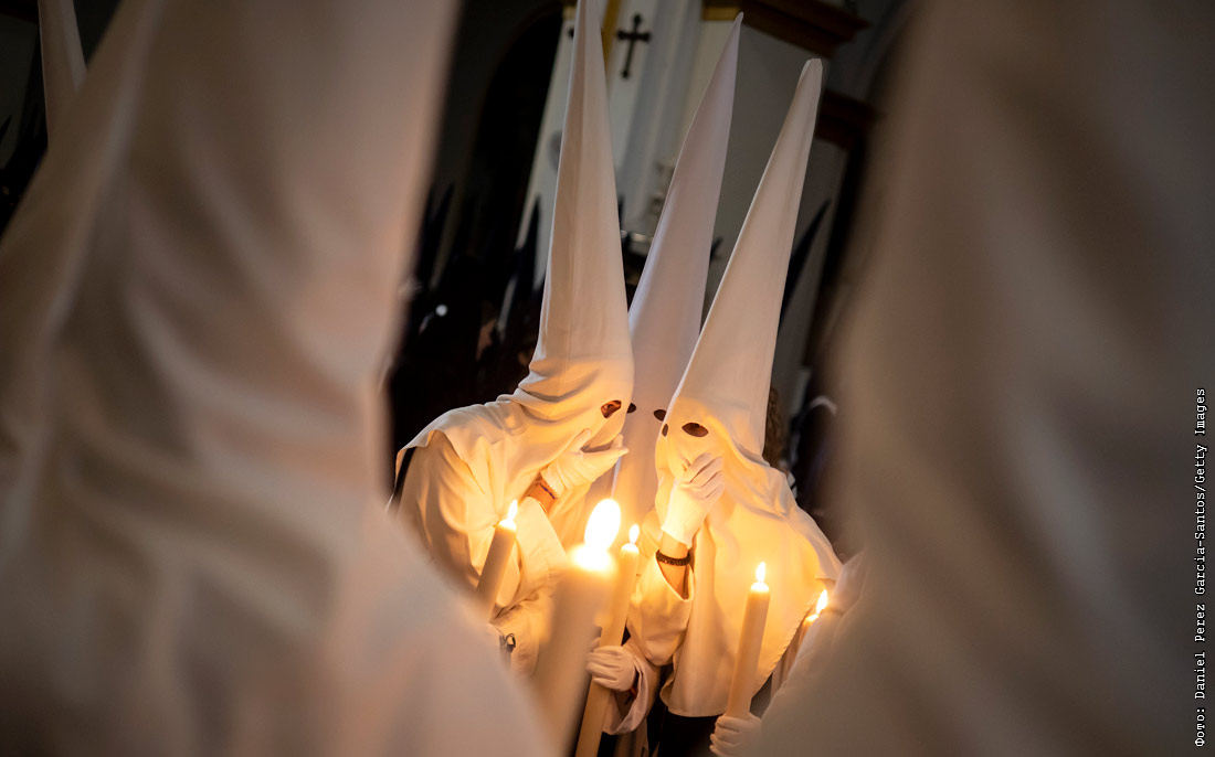 Кающиеся грешники принимают участие в религиозном шествии в Малаге, Испания