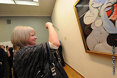 Посетители у картины Пабло Пикассо "Обнаженная в красном кресле" на выставке из серии "Шедевры музеев мира в Эрмитаже"