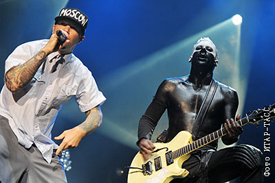 Участники американской группы Limp Bizkit Фред Дерст и Уэс Борланд во время выступления в СК "Олимпийский"