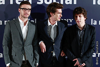 Актеры Джастин Тимберлэйк, Эндрю Гарфилд и Джесси Айзенберг на премьере фильма "Социальная сеть" в Мадриде