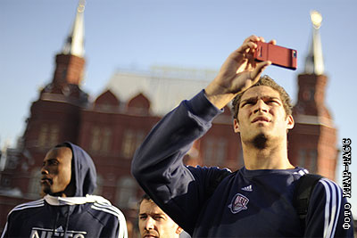 Баскетболист команды Национальной баскетбольной ассоциации New Jersey Nets Брук Лопес (справа) перед открытием первого российского магазина "NBA shop in shop"