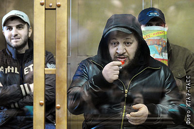 Асланбек Дадаев, Элимпаша Хацуев и Тимур Исаев (слева направо), обвиняемые в убийстве бывшего депутата Государственной Думы Федерального Собрания РФ Руслана Ямадаева, в Мосгорсуде