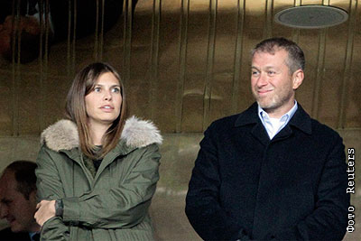 Владелец английского футбольного клуба "Челси" Роман Абрамович и директор ЦСК "Гараж" Дарья Жукова в матче Лиги чемпионов УЕФА: "Спартак" (Россия) - "Челси" (Англия)