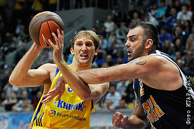 Игроки "Химок" Зоран Планинич и "Прокома" Радко Варда (слева направо) в матче Евролиги УЛЕБ по баскетболу: "Химки" (Россия) - "Проком" (Польша)