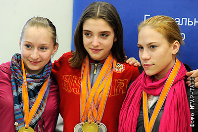 Гимнастки Ксения Семенова, Алия Мустафина и Ксения Афанасьева (слева направо) в аэропорту "Шереметьево"