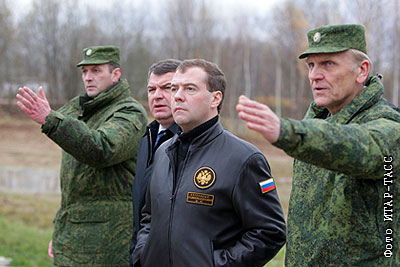 Президент России Дмитрий Медведев во время посещения Центра переподготовки и повышения квалификации стрелков под Солнечногорском