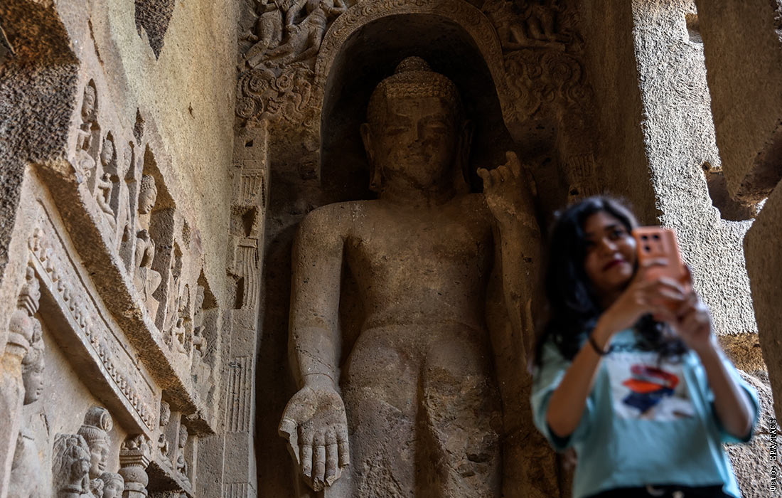 День всемирного наследия в Мумбаи. На фото: туристы в буддийском пещерном храмово-монастырском комплексе Канхери в индийском Национальном парке Боривали.