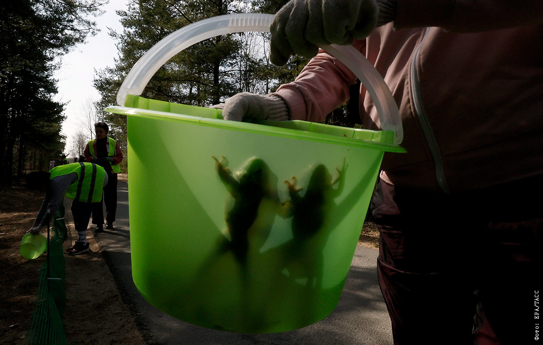 Массовая миграция лягушек и серых жаб во время брачного периода в Сестрорецке